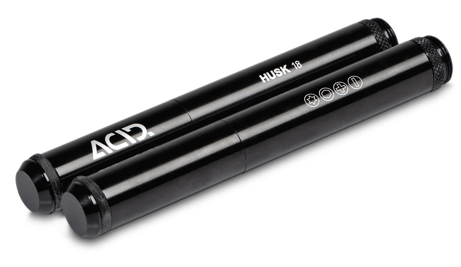 Une boîte à outils de haute qualité dans un espace réduit et un design cool – c’est l’outil multifonctions ACID HUSK 18. Les deux tubes métalliques tiennent parfaitement dans la main. À l’intérieur, 18 fonctions trouvent leur place – bien protégées de la saleté. Le rivet de chaîne et les logements BIT sont rabattables à 90° pour un meilleur effet de levier. Les deux tubes du HUSK 18 peuvent être discrètement cachés dans le guidon grâce à l’ACID GILink pour HUSK ou montés sur le porte-bidon grâce aux supports de cadre ACID.