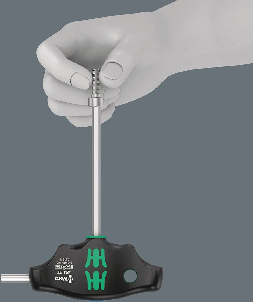 Les opérations de montage/démontage dans des endroits exigus (espace moteur par ex.) empêchent d’utiliser la main pour assurer la vis sur l’outil. Il n’est pas rare que la vis s’échappe. Avec pour conséquence une recherche fastidieuse ou un égarement définitif (sans compter les risques éventuels qui en résultent). Les outils TORX® HF conçus par Wera se distinguent par une optimisation du profil TORX® originel. La force de blocage résultant des pressions superficielles s’exerçant entre la pointe de l’outil et le profil de la vis permet un maintien sûr de cette dernière sur l’outil !